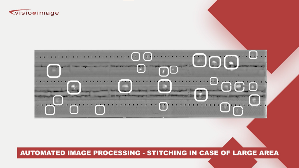 Automatic stitched band result demonstrating large-area inspection capability, showing defects.
