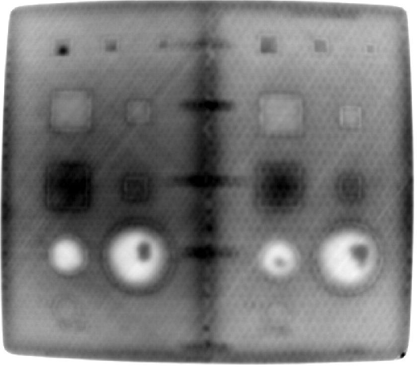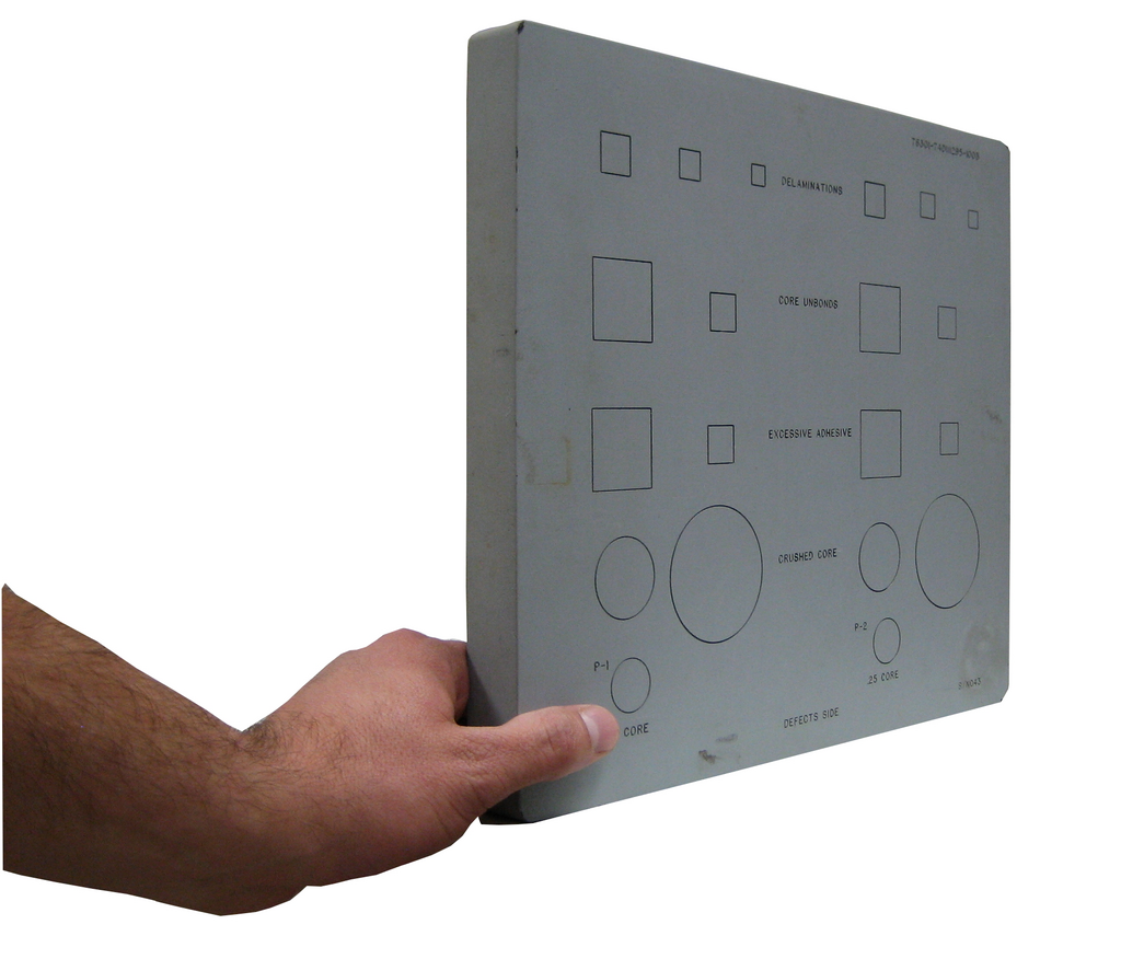 Exemple d’un IRP aéronautique avec une structure en nid d’abeilles. Le fabricant de l’aéronef a inclus des défauts de taille réaliste, représentatifs de ceux pouvant être présents sur un véritable appareil.
